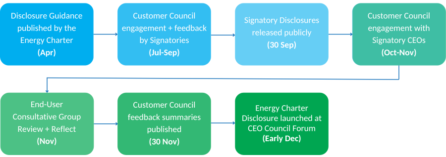 As part of their commitment to The Energy Charter, Full Signatory CEOs agree to publicly disclose how they are delivering against the Energy Charter Principles through Public Disclosures and engagement with their customer/community councils or stakeholder forums, highlighted in Feedback Summaries