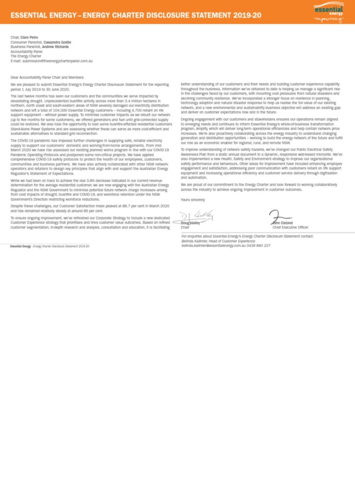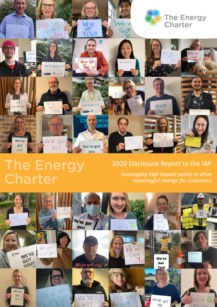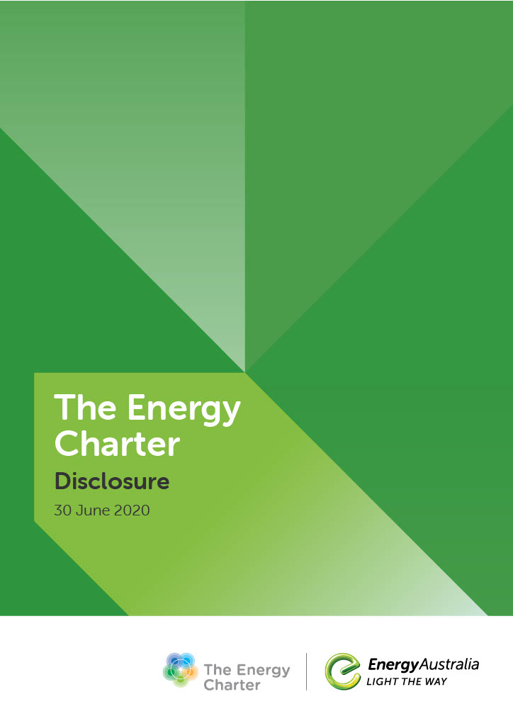 Home Accountability Disclosures 2020 Disclosures 2020 Disclosures + IAP Panel Report IAP Panel Report 2020 IAP Panel Report 2020 Assessment of achievement of better outcomes for Australian energy consumers in 2019-20 Download the 2020 Independent Accountability Panel Report to read the Outcomes Assessment, including:Signatories’ Disclosures including Maturity Self-AssessmentWhat Stakeholders have told the PanelKey FindingsAssessment of Signatories’ Responses to the Panel’s 2020 RecommendationsPanel Observations on Signatories’ 2020-21 Energy Charter DisclosuresPrinciple 1: We will put customers at the centre of our business and the energy systemPrinciple 2: We will improve energy affordability for customersPrinciple 3: We will provide energy safely, sustainably and reliablyPrinciple 4: We will improve the customer experiencePrinciple 5: We will support customers facing vulnerable circumstances You can also download the IAP 2020 Fact Sheet here. 2020 Disclosures Energy Charter Disclosure ActewAGL Disclosure AGL Disclosure APA Disclosure Aurora Energy Disclosure Ausgrid Disclosure AGIG Disclosure CleanCo Disclosure CS Energy Disclosure Endeavour Energy Disclosure Energy Queensland Disclosure EnergyAustralia Disclosure Essential Energy Disclosure Horizon Power Disclosure Jemena & Ovida Energy Disclosure Origin Energy Disclosure Powershop Australia Disclosure Powerlink Queensland Disclosure Stanwell Disclosure TransGrid Disclosure 2020 CEO Meeting Recordings Guidance to Signatories Read the Energy Charter Independent Accountability Panel 2020 Process Guidance to Signatories which details:The IAP’s view of the Energy CharterIAP Expectations of the DisclosuresPublic ConsultationIAP Final ReportCEO Council review 2020 Guidance to Signatories