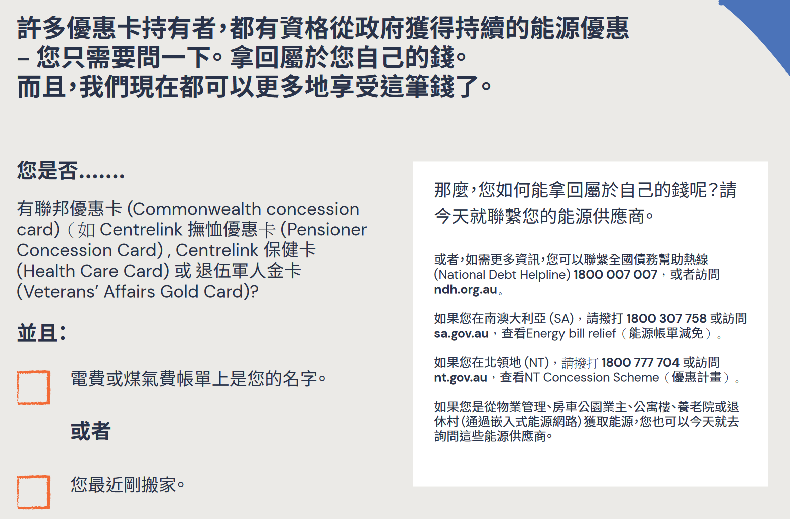 Home Keep the money. It's yours. Keep the money. It's yours. (Chinese Cantonese/繁體中文) Chinese Cantonese / 繁體中文 留着这些钱吧。 这是您的钱。 您可能有资格申请能源帐单的政府支持。请勿错过这个机会。
