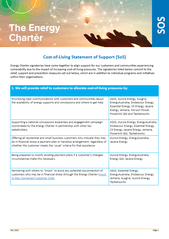 Why: To assure customers and communities that the energy industry is working together to address cost-of-living pressures, Energy Charter signatories have come together to align support for customers and communities experiencing vulnerability through an Industry Statement of Support (SoS).