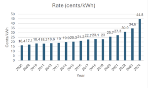 Consider the case of California. The largest utility, Pacific Gas & Electric Company (PG&E), serves northern California, which is home to 14 million people. The average residential rate stood at 44.8 cents/kWh in January 2024. Using its E-1 tiered rate as a point of reference, the price of electricity has doubled over the past seven years, far exceeding the rate of inflation. In the seven years prior to 2017, it had grown by 23%. As a point of reference, in 2008 the average retail rate was 16.4 cents/kWh. The history of the average residential rate for PG&E is shown below.