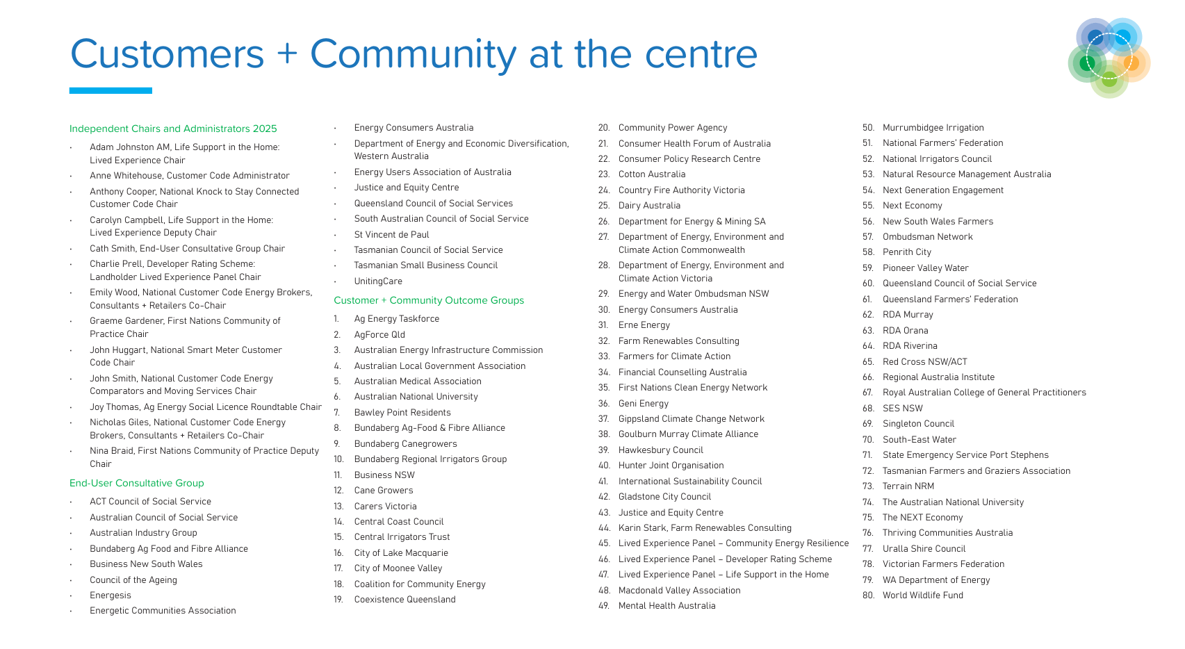 At the heart of the Energy Charter is collaborating and engaging with customer and community representatives to ensure customer and community are at the centre of the energy system. Each #BetterTogether initiative has a Customer or Community Outcomes Group (COG) which is instrumental in guiding each initiative.